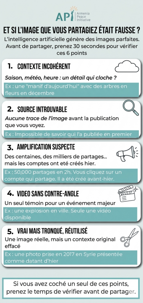 Pour toutes ces raisons, Armenia Peace Initiative s’est engagée à approfondir ces enjeux. Face à la multiplication des campagnes de désinformation, de mésinformation et de malinformation, renforcer la compréhension de ces phénomènes apparaît aujourd’hui essentiel. La capacité à s’informer de manière fiable constitue un pilier fondamental du fonctionnement démocratique. À notre échelle, nous entendons ainsi contribuer à une meilleure hygiène informationnelle, en soutenant les efforts d’analyse, de sensibilisation et de décryptage.
